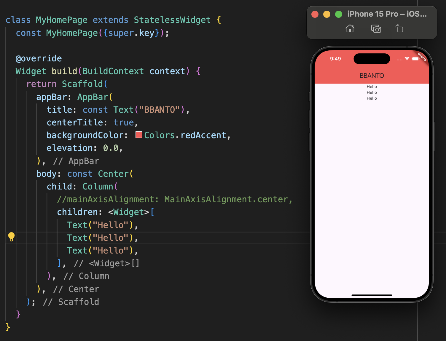 Column의 mainAxisAlignment 속성을 : MainAxisAlignment.center 로 설정하면 위와 같이 중앙에 위치하며,