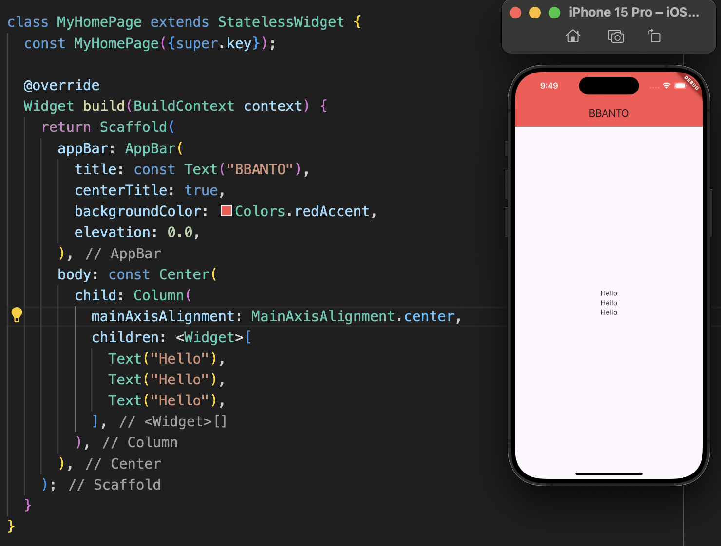 body의 속성을 Center로 설정하고 MainAxisAlignment.center 로 설정하면 위와 같이 가로 및 세로가 중앙으로 정렬 됩니다!