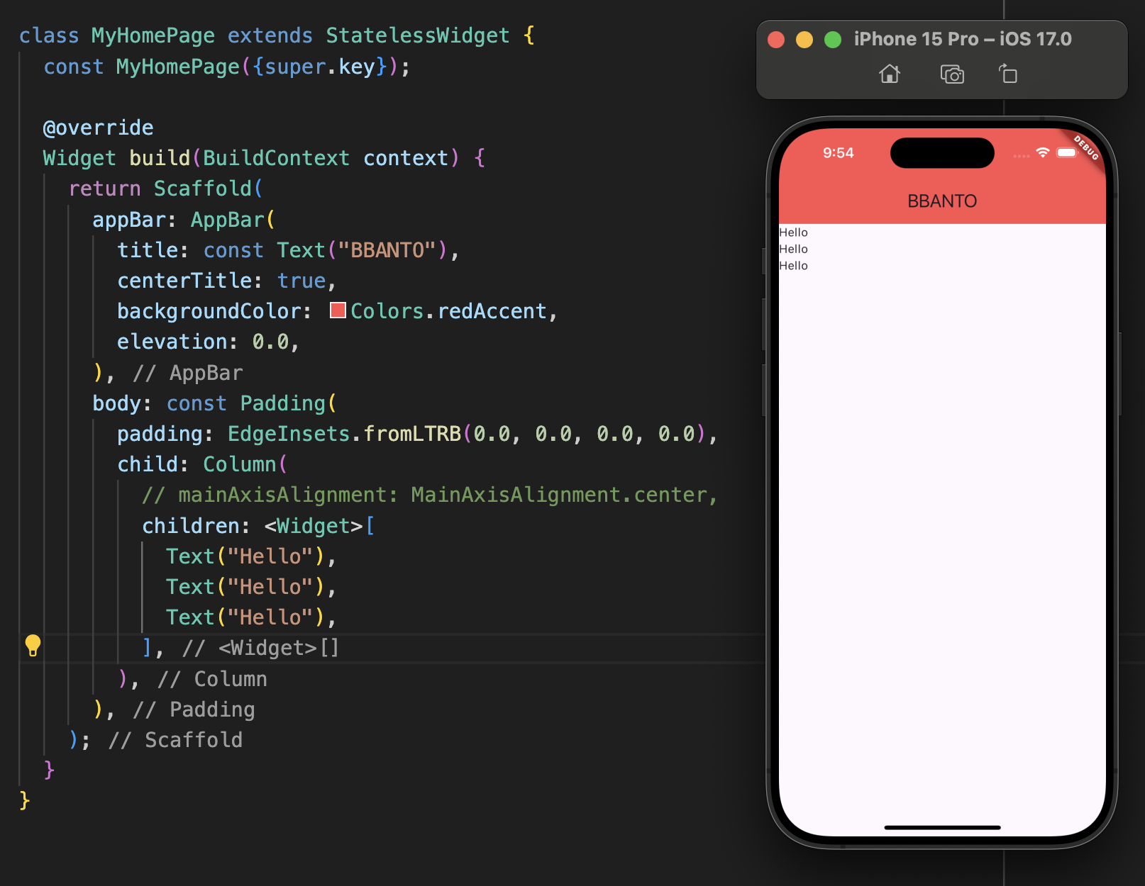 body의 속성을 Center로 설정하고 mainAxisAlignment 속성을 주지 않으면 위와 같이 Center로 정렬 됩니다.