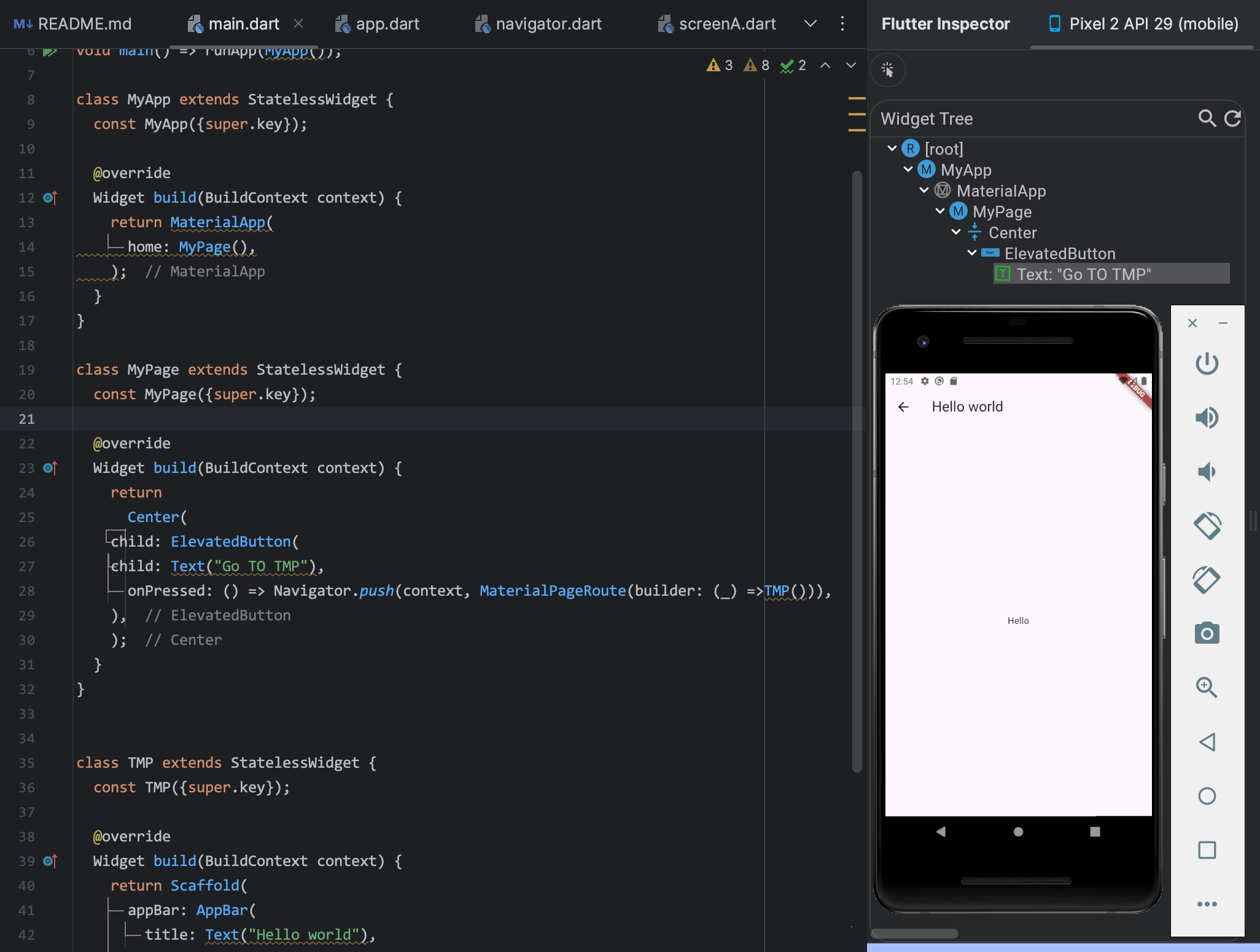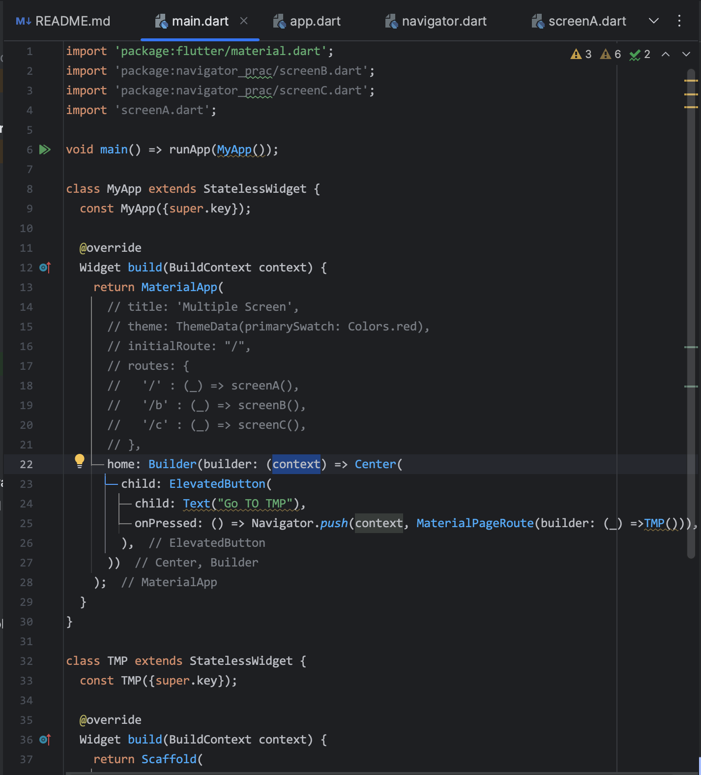 해당 코드에서 Navigator.push가 TMP로 이동하지 않는 이유는 context가 MaterialApp의 하위 트리에 포함되어 있지 않기 때문입니다. Navigator는 MaterialApp 내에서 사용되어야 하는데, 현재 Center 위젯의 context는 MaterialApp의 하위 트리가 아닙니다!